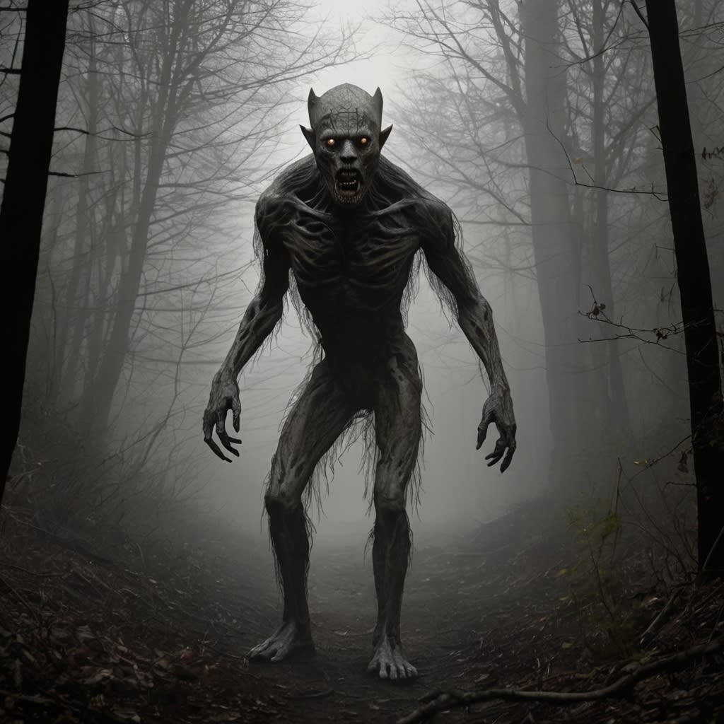 The beam illuminated a figure standing at the edge of the clearing. It looked like a man, but its face was wrong, stretched into a grotesque grin that didn’t reach its dead, black eyes. Its head tilted unnaturally as it stepped closer.