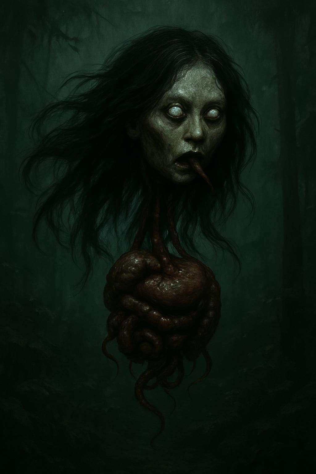 A floating human head with entrails dangling beneath it — heart, lungs, stomach all still connected, pulsing and wet. Its eyes were milky white, its hair wild like a nest of snakes. The head hovered closer, tongue flicking, sniffing for newborn blood. It was the Palasik — a cursed being that feeds on unborn and newborn children.
