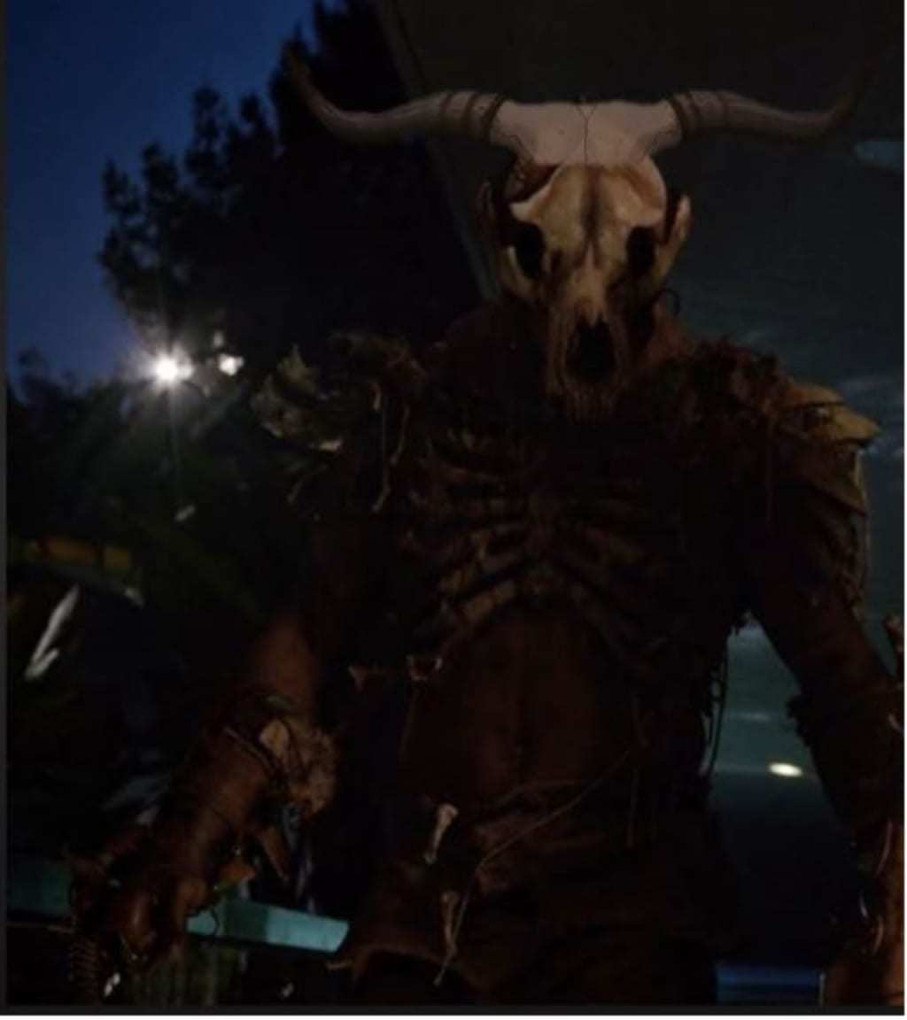 “I’m going to look around,” says Jason. He turns on the flashlight from his cell phone to walk the halls. He begins to leave Lacey’s side and the weight of his heavy boots creaks the wooden floor panels with each step. Lacey is left standing alone in the living room. Jason follows the glimmer of the lit candle on the window seal in the bedroom. He sees old pictures of different shaped and sized vintage gold frames on a dresser, covered in dust and webs. He picks up a few and examines them then puts them back down. With the flicker of the light from the lightning, there is a tall broad figure with a mask of a longhorn skull over his face, a long black coat, and large talons for fingers standing there watching Jason. He doesn’t notice the mysterious figure, but he suddenly feels a chill creeping down his back as if someone was observing him. He quickly turns around towards the window, another flash of lightning showed but the figure was gone. “Hey! There you are. What are you doing in here?”, Lacey says, as she pops in the doorway of the bedroom startling Jason. “Nothing, I was just looking at these pictures”. Lacey walks in further, “Why are the faces scratched out in all of them?” she asks. “Weird right?”, Jason replies. “Yeah”. Jason turns towards the bed and says, “well at least there’s a bed”. “Ew, those sheets probably haven’t been changed in decades”, she says. “It’s not like we have any other options, it’s just one night”. They don’t bother removing the sheet and blankets, they just lay on top of them with his arm around her. “Can you blow out the candle?” “Oh I forgot”, Jason says as he gets up again to blow out the flame. He gets back in bed and goes back to cuddling with Lacey. They fall asleep to the sound of a cool breeze and owls hooting. The large haunting figure continues to watch them sleep through the window.