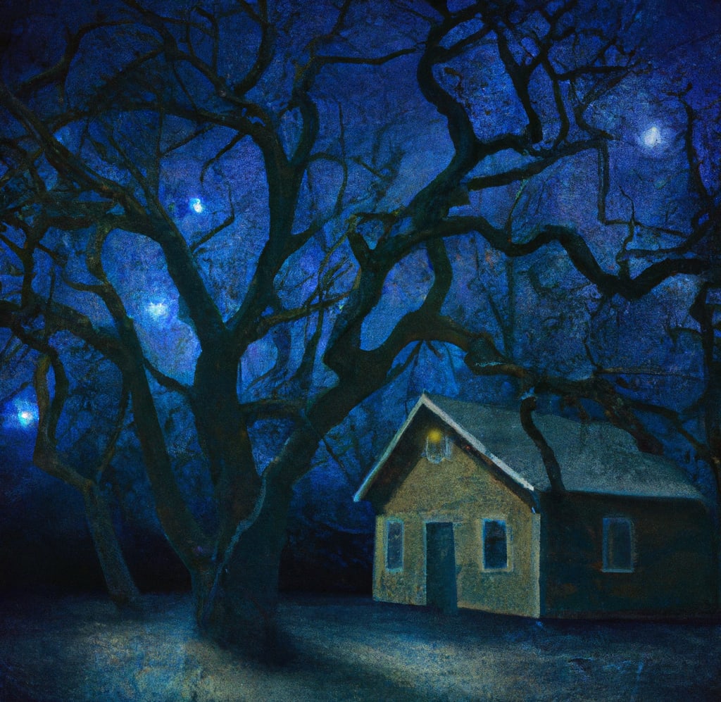 I appeared on the left side of the cutout in the forest. A small creek ran through the small plot of land. To the right stood a house under a tree, like an oak. Its branches, hundreds of feet wide, spread across the night. The branches covered the entirety of the sky above the cabin.