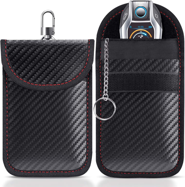 The Faraday Pouch for car keys is a must-have accessory for anyone concerned about car theft. This small but powerful device is designed to protect your car's key-less entry system from hacking signals and prevent thieves from stealing your vehicle. By simply placing your car key fob into the Faraday pouch, you can effectively block EMF, RFID, and other hacking signals. The pouch is constructed with premium carbon fiber textured material and two layers of shielding materials, making it suitable for all key fob sizes. The upgraded design features a zinc alloy hook and inner key chain, making it more strong and portable. Additionally, Lanpard provides two medium pouches for those who need to protect multiple vehicles in their household. With a 100% satisfaction guarantee and lifetime warranty, you can trust the quality and effectiveness of this product. Overall, the Faraday Pouch is a convenient and reliable way to secure your car and protect your belongings from hacking signals.