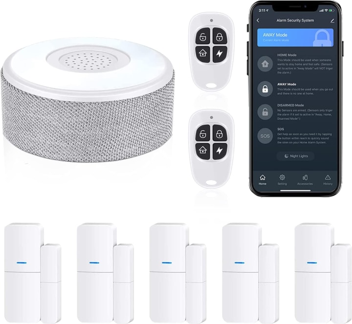 The Wireless DIY Smart Home Security System by tolviviov is a comprehensive and affordable solution for keeping your home secure. The 8-piece kit includes 1 alarm siren station, 5 windows & door sensors, and 2 remote controls, allowing you to easily monitor and control your home's security without any contracts or subscription fees.