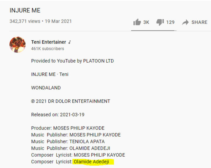 Yup! One of the standout tracks from Teni’s latest Wondaland album is the song ‘Injure Me’ which she went ahead to make a single and give a music video because of how good it is. What many don’t know is that Olamide actually co-wrote this song along with Moses Philip Kayode. It’s even in the song’s official Youtube data page. E shock you?
