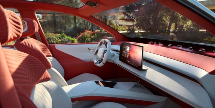 The interior is roomy and light-filled. The dashboard is simple and has LED accent lighting up front. At the base of the windshield is a full-width display that shows car information, and in the middle is a touchscreen display with a title. Since the touchscreen controls everything, it is safe to anticipate that this will not sit well with the European New Car Assessment Program. The front and rear seats are covered in Verdura, a textile made of plants and minerals that has a corduroy-like texture. The room feels airy and spacious because of the panoramic roof.