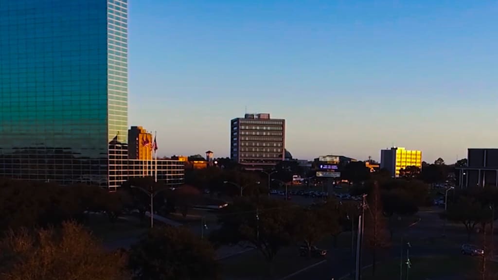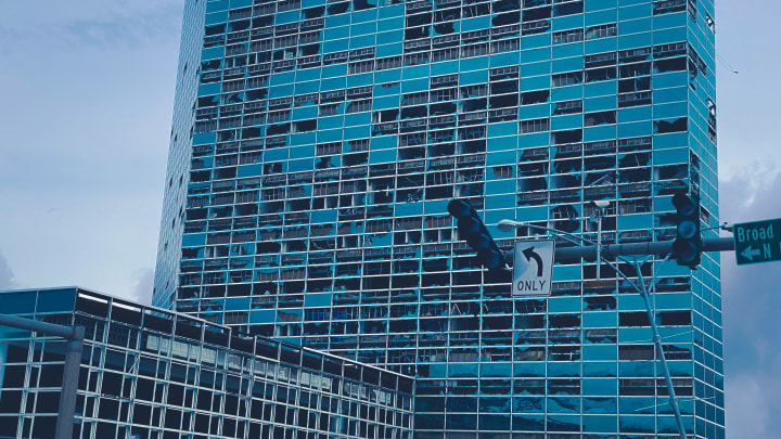 The Capital One Tower, the most symbolic feature in the Lake Charles skyline due to its height and L-Shaped design, has most of its windows blown out. The green glass inundates the streets.