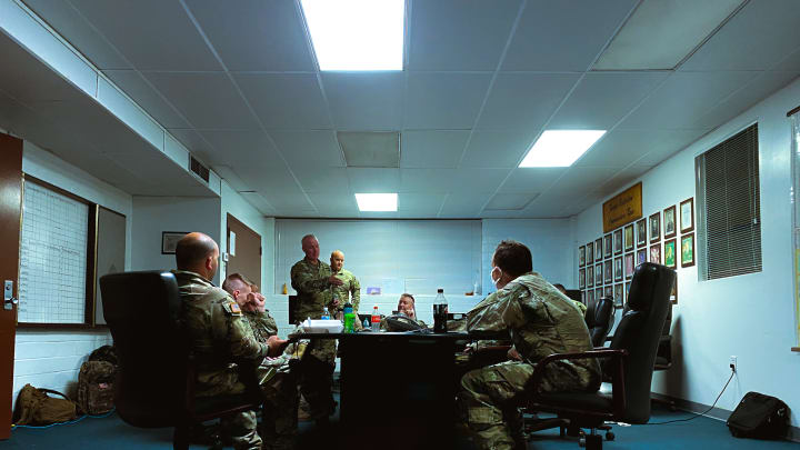 Senior leadership issues missions from tables set off to the side.