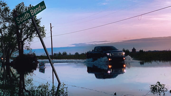 The debris left on the side of the road after Laura holds water like dams. Water floods homes where blue tarps are ripped.