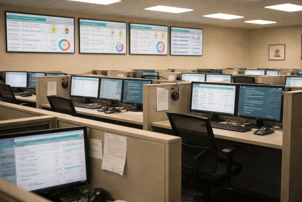 Lina logs in at 8:59 a.m., one minute early. The system rewards punctuality with a green checkmark next to her name. A small celebration, invisible to anyone except the software. Her performance metrics bloom open on the screen like a second nervous system: average call time, customer satisfaction, escalation rate. Each number pulses gently, alive with consequence.