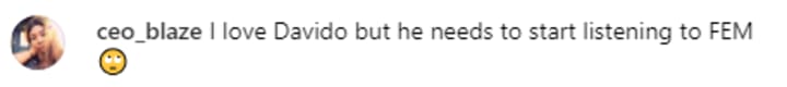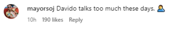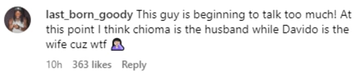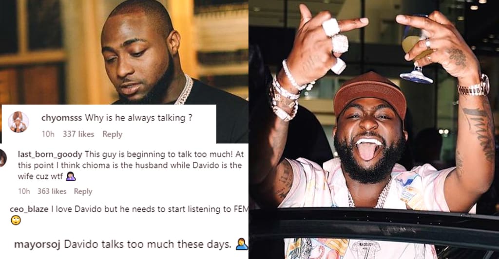 This revelation quickly got people talking and overwhelmingly a lot of the responses were saying the same thing: that Davido is beginning to talk too much these days. One person wrote saying "I love Davido but he needs to start listening to FEM", while somebody else said "Na only Davido dem dey grant interview left and right...it is well!" and another said "This guy is beginning to talk too much! At this point I think chioma is the husband while Davido is the wife cuz wtf". Ouch!