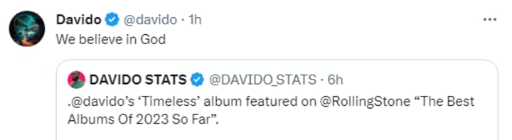 Hahaha! It's good to see that Davido has a good sense of humour about all this. In fact, the singer has a lot to celebrate right now. The singer just today too found out that his album "Timeless" has been featured on Rolling Stone's "The Best Albums of 2023 So Far" list.