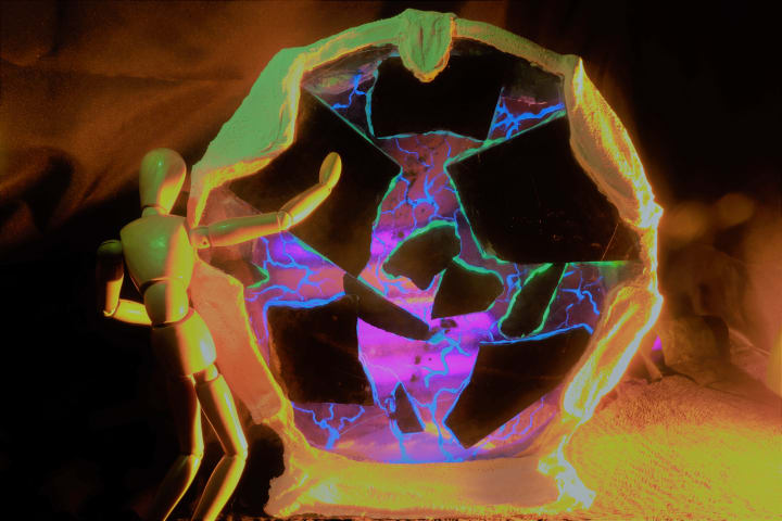 Standing silently, the vast energy of the universe cradling me in a pulsating glow. The fractured moon passes as the hollow of its core shows structures of civilizations past. Slowly I help myself to the ground, realizing I am the same as all. I touch down on familiar ground. The environment unfolds around me as my heart fills my head with the images from days gone by. There is more… I also have the impression of images of the places I have never been, may be fantasy, some real.