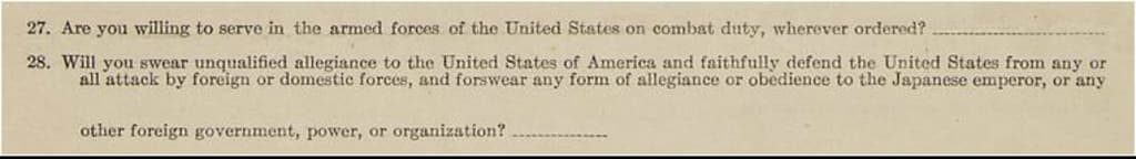 Will you swear unqualified allegiance to the United States of America and faithfully defend the United States from any and all attacks by foreign and domestic forces, and forswear any form of allegiance or disobedience to the Japanese Emperor, or any other foreign government, power, or organization