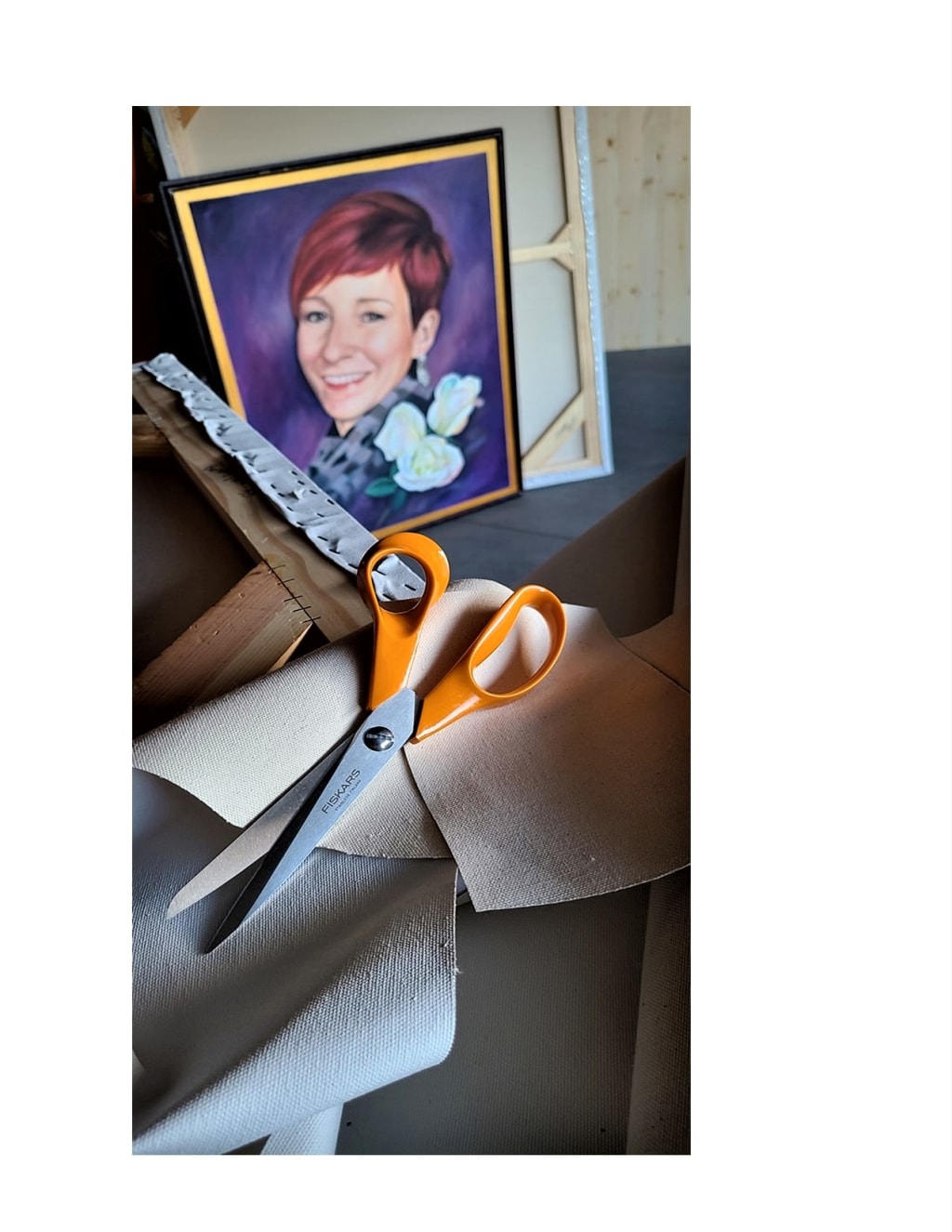 Being a small nonprofit means that we have a tiny budget. Because of this, we hand-make all our canvas frames and cut and stretch our own canvas. We buy our pine locally and custom cut it to the 30”x 40”size that all our portraits are painted on. Then, we purchase huge rolls of canvas. Canvas is a thick, coarse fabric. This is where our Fiskars scissors becomes our main tool. Fiskars scissors are able to stay sharp and keep an edge while cutting the hundreds of yards of canvas we need to keep making the portraits that we paint.