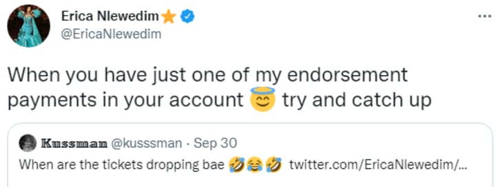 Then the Kussman went to pull up a tweet which he had made which said "Waiting on asake & Erica's concert dates" which Erica herself had liked, and said to Erica "when are the tickets dropping bae🤣😂🤣 ".