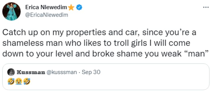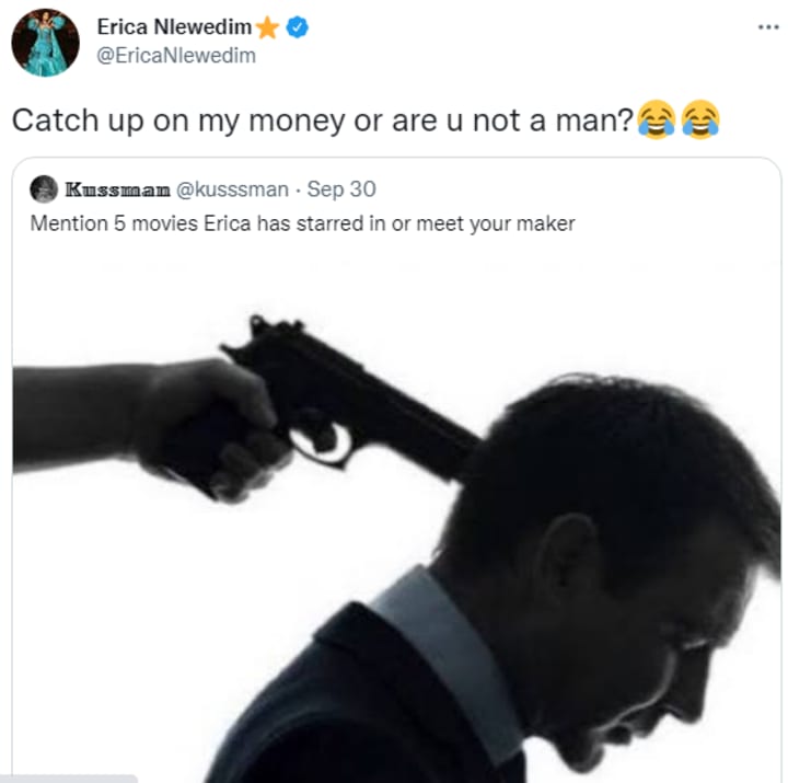 The Kussman, who at this point is clearly trolling the actress then made a post saying: "Mention 5 movies Erica has starred in or meet your maker". In response to that, Erica said: