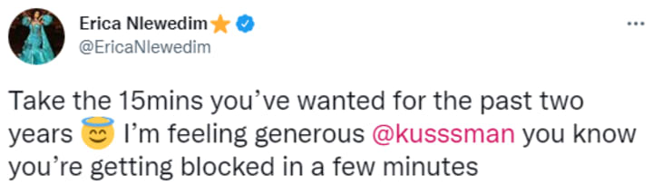 Erica saw this tweet, and of course taking offence to it wrote back: