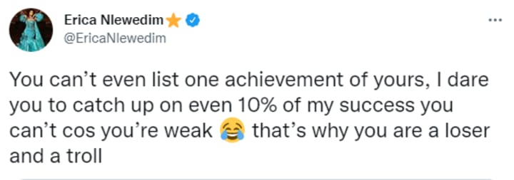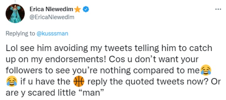 Lol see him avoiding my tweets telling him to catch up on my endorsements! Cos u don’t want your followers to see you’re nothing compared to me😂😂 if u have the 🏀 reply the quoted tweets now? Or are y scared little “man”. I’m sure he’s a little man everywhere, quite sackless. That’s what little boys do when they see girls doing better than them and they can’t measure up, they try to pull them down. Can never be me. Google me, if you don’t watch Nigerian movies you have definitely seen my endorsements, now tell me your own achievements? You can’t even list one achievement of yours, I dare you to catch up on even 10% of my success you can’t cos you’re weak 😂 that’s why you are a loser and a troll. So obsessed! Bye Felicia 👋🏽