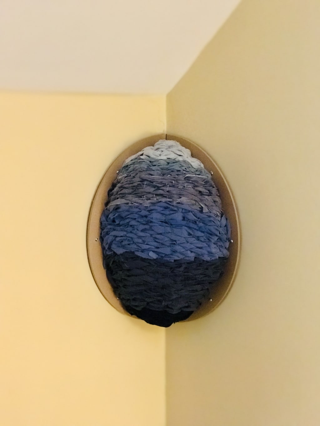 Weaving is a way I can upcycle and reuse items. I save clothes and bedding that is not good enough to donate and I make rag rugs or wall hangings (like the photo I submitted) with the material. I started a new hobby just within the last few years. My husband built me a small loom to make rugs. I recently took a mixed media class; I am finally finishing my BFA at the age of fifty-one. We were challenged with making items and working with material, we had not worked with before. I decided I was going to weave on everything. I used a plastic piece that was on the front of a box fan and weaved a sun/sky image. I used a large embroidery hoop (eighteen inches across) with an old fishing net to create a type of “cross stitch”. I found an old ironing board, cut it into three pieces and weaved a piece from a bicycle tire through the holes. My favorite was the image I have attached. I had a wooden circle that I cut in half and put chicken wire in the void. I then weaved fabric through the chicken wire creating various landscape themes. I have never thought about how the corner of a wall (or recessed corner) is left undecorated.