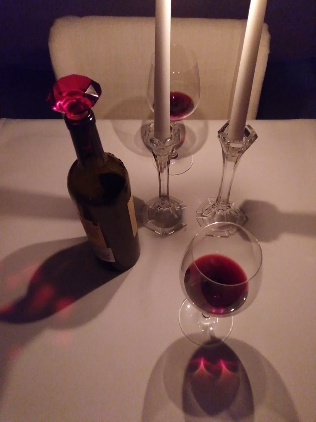 “Chicken’s done.” I said. So, we moved over to the dining room table and sat down where I offered him a glass of Merlot – a favorite we both shared. “Yes, please.” He replied with a grin that made my hands tremble a bit. We held our glasses up and toasted. “Finally!” We said in unison. I took a sip and he took a much longer one.