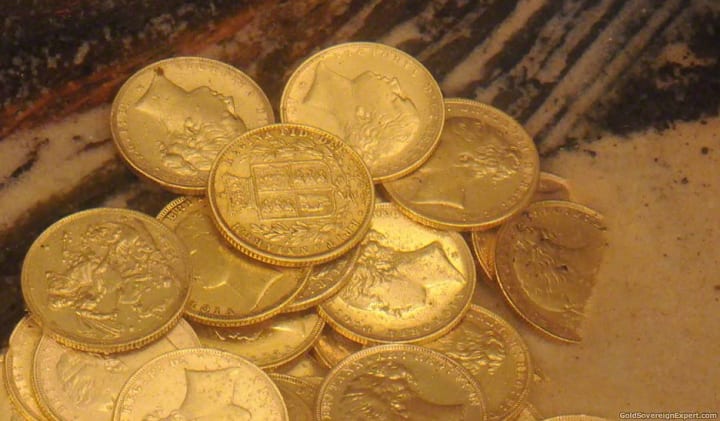 Back to the box – I quickly push around in the dirt at the bottom. Buried beneath, I pull out several coins, each one the size of the small of my palm and extremely heavy. I brush them clean, I can see they are gold, or at least should be were they not so discoloured. There is a man’s face adorned on the front of each coin; a horse and soldier slaying a dragon embossed on the other.