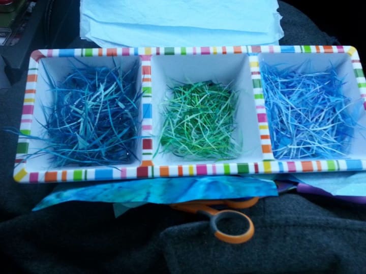 The scissors are easy between my fingers, familiar. They carve a serpentine path along swaths of blue tissue paper, one row after the next, undulating gracefully between corners, paper waves slipping into a waiting tray with a whisper. I get lost in the rhythm of these waves effortlessly. Hours pass like moments while trays of blue, aqua and teal fill beneath my fingertips. Leaves, too, with their slow and steady rhythm transform seconds into hours. Snip, snip. One. Snip, snip. Two. Flower petals, one arched snip after another. Each taking its own unique shape, to be assembled at some point into something greater than itself. Though these - the leaves and petals - can be more challenging here, so small and impish, they easily slip beneath a fingernail or blow askance in the current from the air conditioner, lost forever. Cutting water is easier.