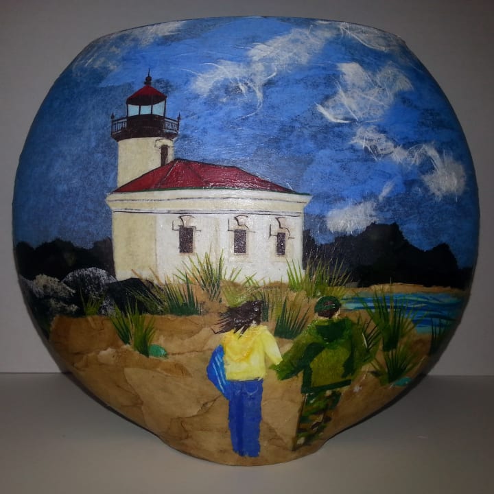 The year passes so fast. We miss only one weekend with my mom. And, that, because I have the thought to call her when I get a bit of a cold. She can’t risk the visit; she’s too vulnerable. I still do art. I have more to show her the next time we come. The year is marked by my three biggest pieces to date: The Coquille lighthouse for her best friend, her doctor’s farm, and Sunset Beach for the woman in HR who helped my mom transition from work to disability and ensured my dad would have insurance in the aftermath. They were heartfelt, deeply thought-out pieces, their inspiration taken from what my parents had been able to learn about these people who’d become so important in their lives and what I’d been able to learn from talking to my parents about them.
