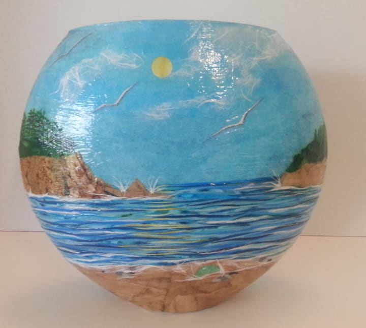 The gift she gave me with those moments of sitting vigil and her enthusiastic support are buoying me through the ups and downs of this crazy life 7 years later. My art has been elevated to a level I would never have thought possible. We’ve put many thousands more miles on the passenger seat art studio, which has become a staple of our road trips. I’ve lost count of the number of pieces my trusty scissors have left in their wake. I could never possibly remember each and every pendant, ornament, votive or wine stopper, but I do remember the joy of sitting next to my husband on a sunny day singing and creating in the passenger seat, the quiet, meditative moments at my art table, the beautiful connection my art has facilitated with people from all over the country and the indescribable elation at seeing my art bring joy to others.