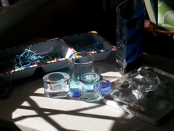 The fingers of my right hand slip into the scissor handles like a well-worn glove, an array of blue paper in my left. Late afternoon light drifts through the window, spilling over the pieces of glass I have staged for my next series.
