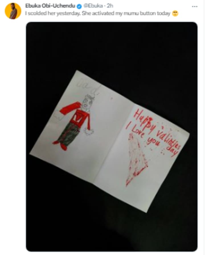 Valentine's Day is not only a day for lovers to celebrate each other. It is also a day when family members show love to each other. For Valentine's Day today, media personality Ebuka Obi-Uchendu showed off how his daughter made him an adorable valentine's day card after he scolded her yesterday. He shared the image of the card along with a caption that said:
