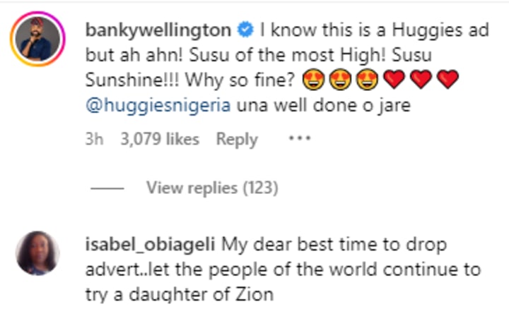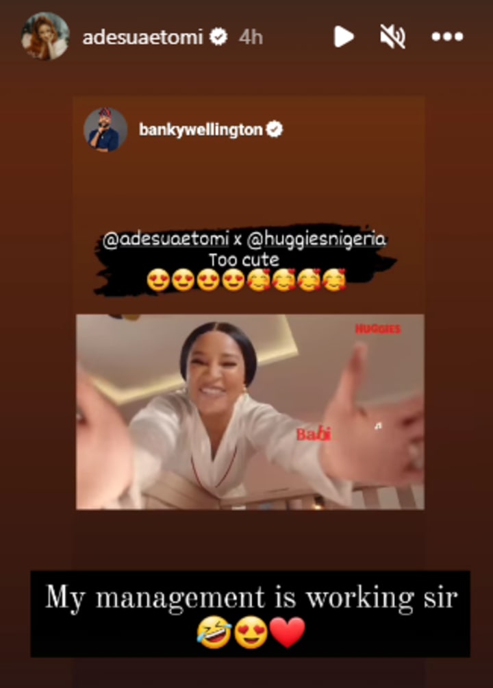 Initially, Adesua turned off her comments shortly after the news broke. But then earlier this afternoon, she took to social media to post an advertisement video for Huggies. In the comment section of the video, which she has left open, her fans and colleagues begun celebrating her for using the publicity to her advantage to make money. One user said: "My dear best time to drop advert..let the people of the world continue to try a daughter of Zion", while another said "Please promote your brand, peaceful queen 😍 No weapon fashioned against your union shall ever prosper. Let the potatoes keep potating, you're blessed and so is your union. 🙏❤️❤️".