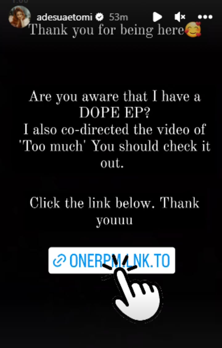 Emboldened by the support of people telling her to keep using the attention for promotion, Adesua has now taken to her social media this evening to start plugging multiple businesses of hers including her music video so that people can consume. According to the actress, "My management is working!"