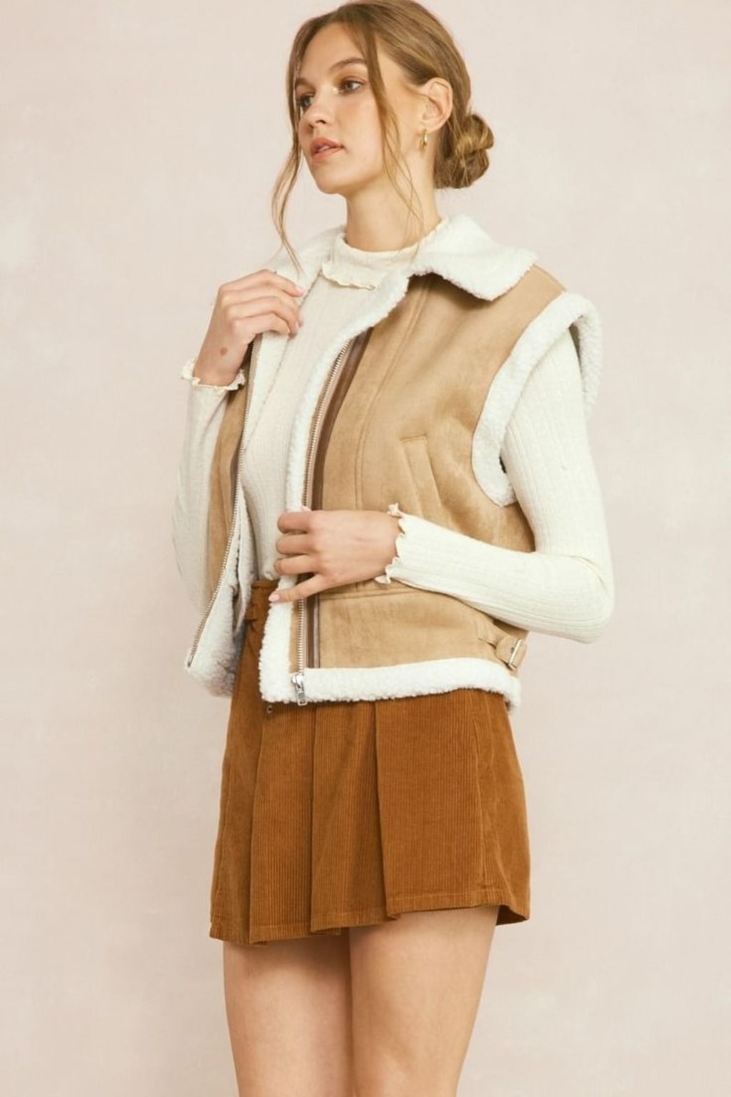 For example, pair a brown shearling vest with a tan sweater, beige trousers, and brown boots.