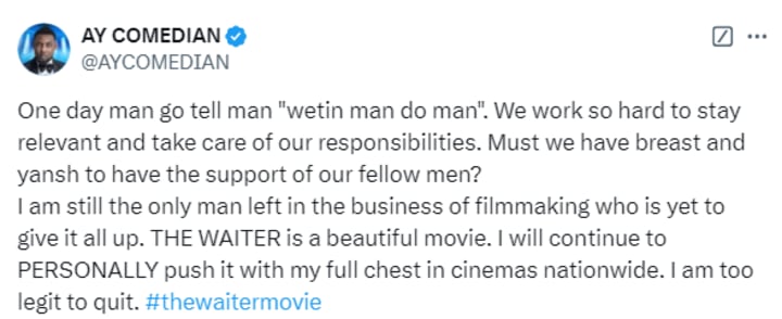 I am still the only man left in the business of filmmaking who is yet to give it all up. THE WAITER is a beautiful movie. I will continue to PERSONALLY push it with my full chest in cinemas nationwide. I am too legit to quit."