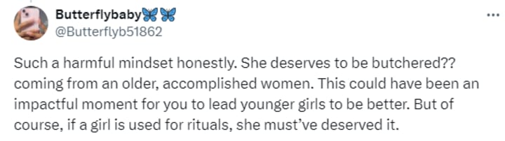 BUTTERLFY BABY (Twitter User): Such a harmful mindset honestly. She deserves to be butchered?? coming from an older, accomplished women. This could have been an impactful moment for you to lead younger girls to be better. But of course, if a girl is used for rituals, she must’ve deserved it.