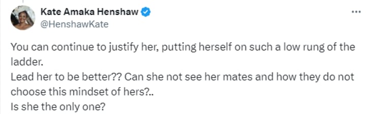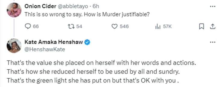 Then, another user said in response to Kate's initial comment about the video saying "This is so wrong to say. How is Murder justifiable?" to which Kate Henshaw once again doubled down saying:
