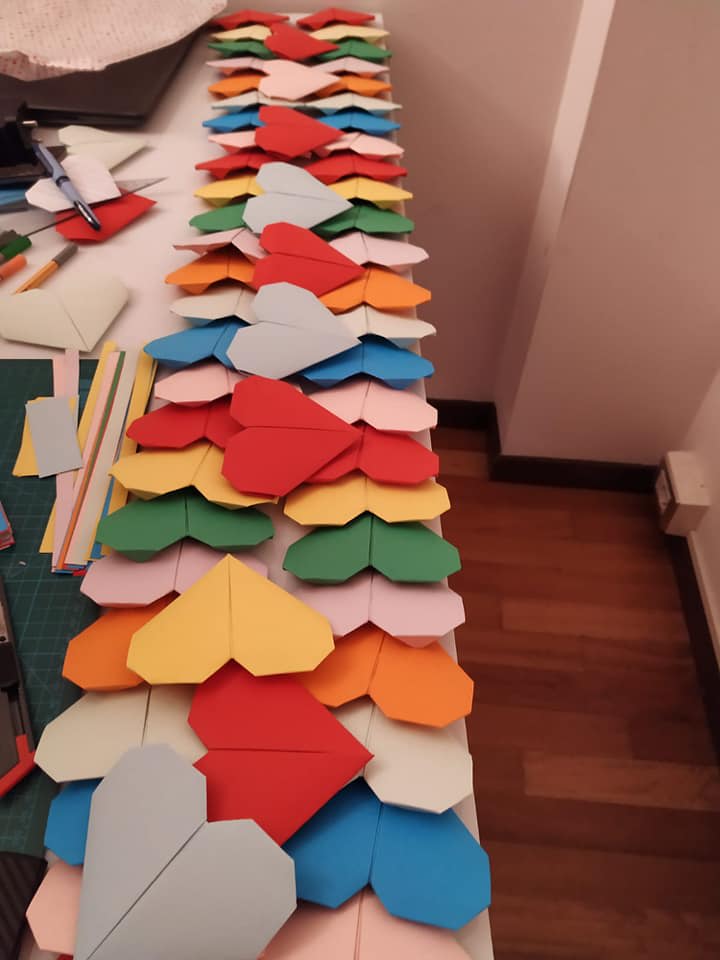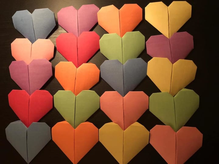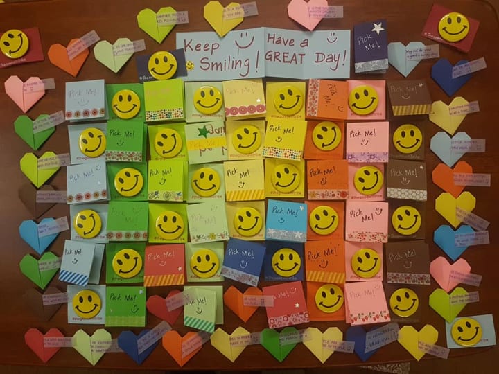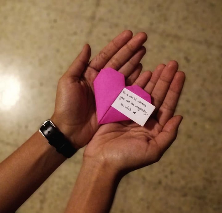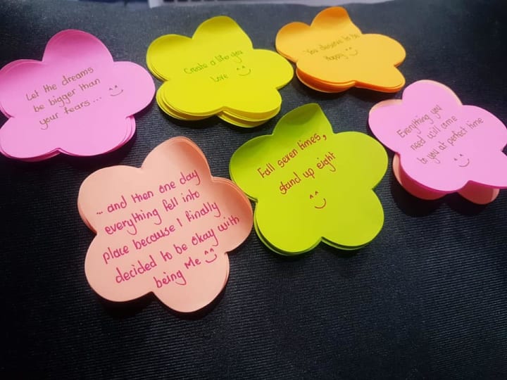 To have a common thread to the whole thing, and also add a spark of joy to the ones who would be going out and making others' day, I shared YouTube videos of making an origami heart, that can hold a note inside it. My friends had a ball of a time to create these colourful hearts, and enjoyed this process of writing inspiring positive affirmations inside each of the heart. Some of my friends got creative and used colourful post it notes and stuck them at places where people could find them.