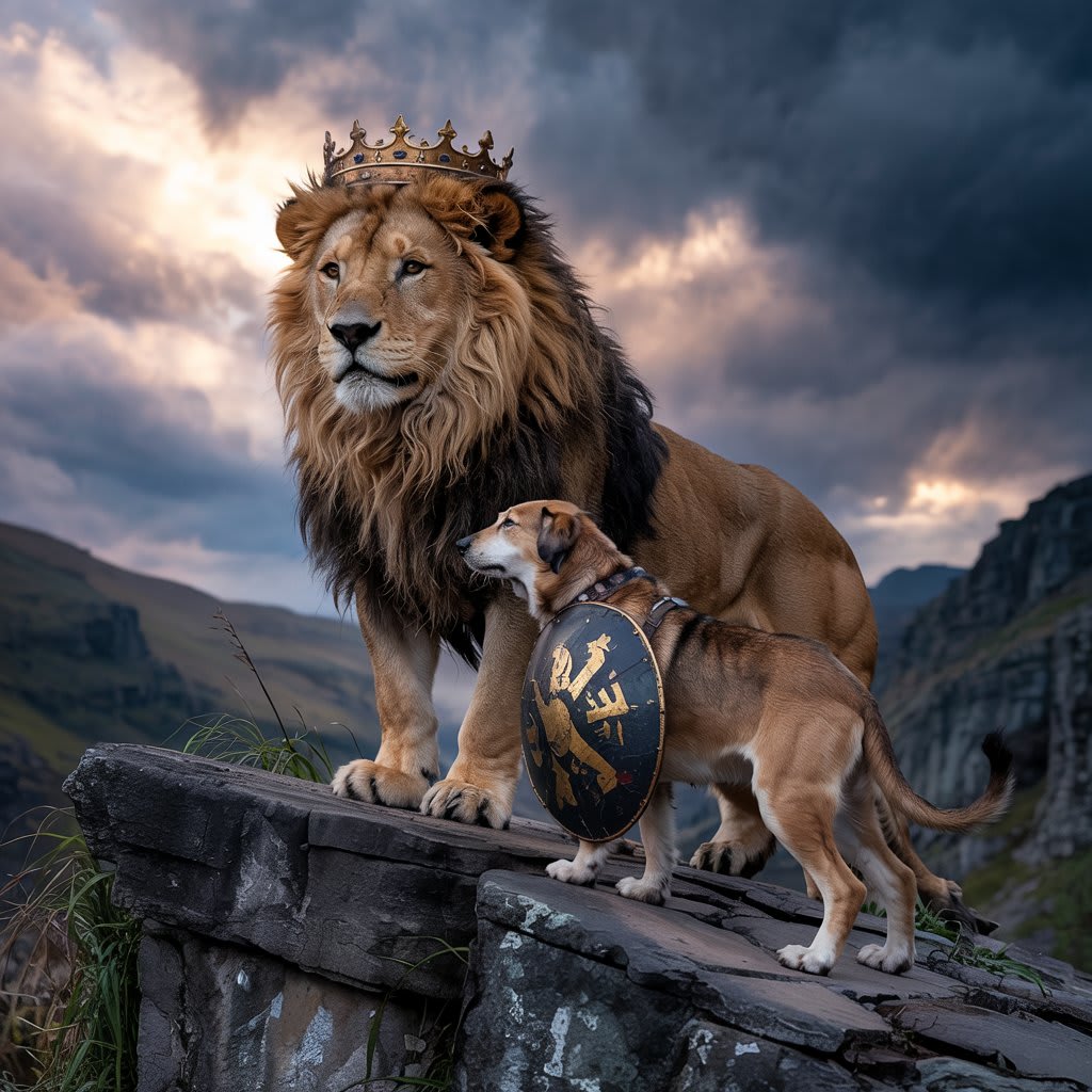 The last ruler of Elaria was King Kaelen, a lion of unmatched strength and honor. His mane shone like fire in the sun, and his roar echoed across valleys like thunder. Yet even a king must have his shield—and that shield was Bran, a great mountain dog, bound to Kaelen since they were cub and pup.