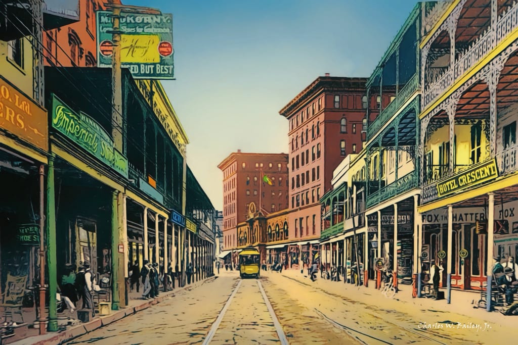 Passing by Jackson Square, she saw several painters set up, trying to capture some of the magic the streetlamps created as they glinted off the wet pavement. A small band played jazz music nearby, drowning out the soft calls of the ladies of the night who ambled around the hedges, looking for clients.