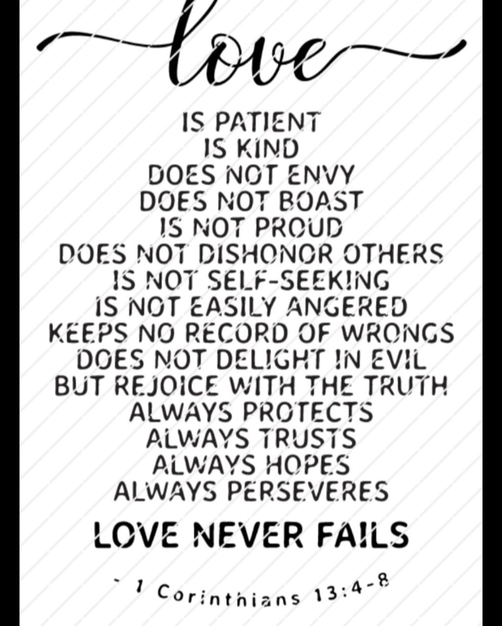 Love does not delight in evil but rejoices with the truth.It always protects, always trusts, always hopes, always perseveres.Love never fails