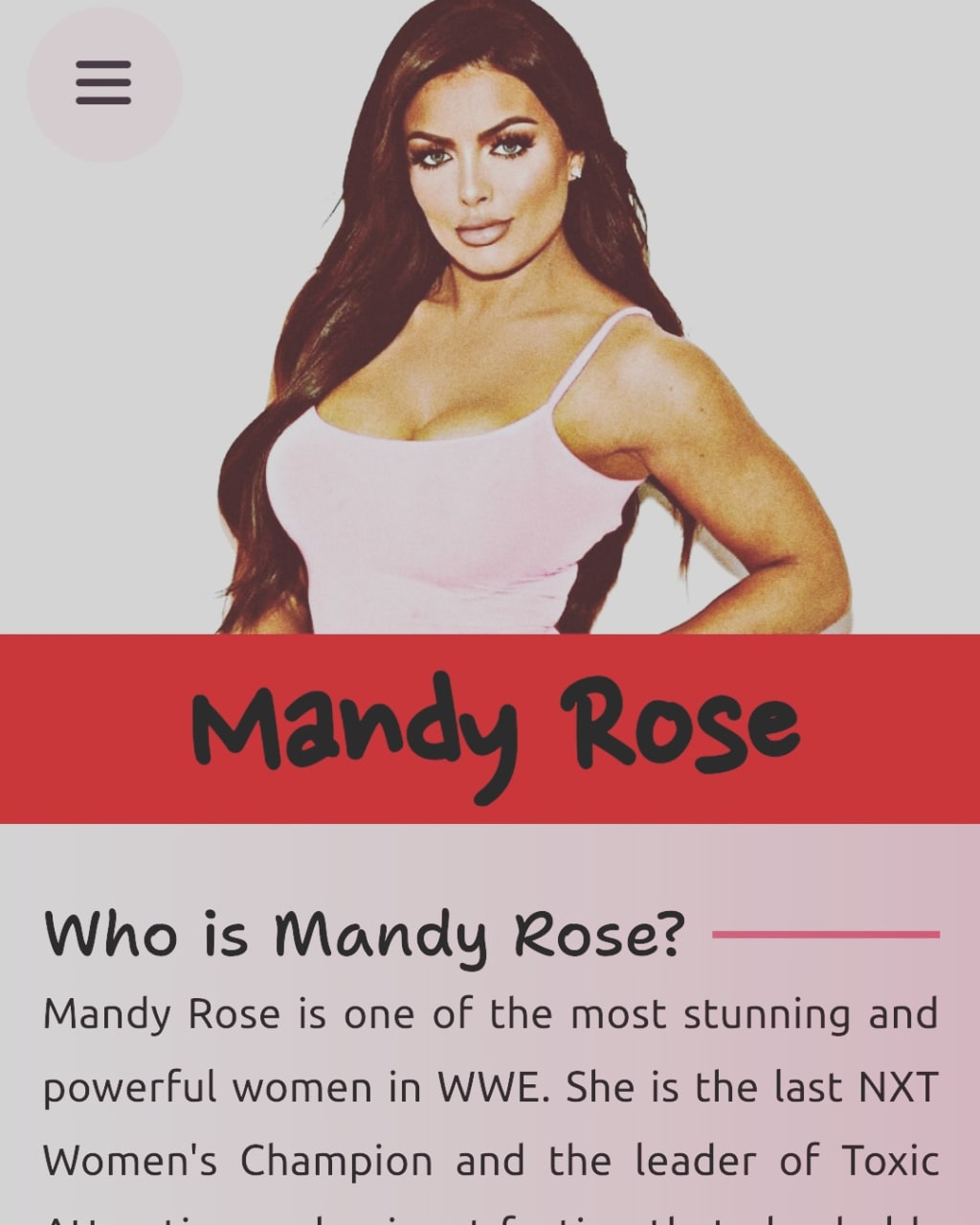 Mandy Rose is one of the most stunning and powerful women in WWE. She is the last NXT Women's Champion and the leader of Toxic Attraction, a dominant faction that also holds the NXT Women's Tag Team Championship. She has also competed on the main roster, where she was part of Absolution, Fire and Desire, and a tag team with Dana Brooke. She has also appeared on reality shows such as WWE Tough Enough and Total Divas.