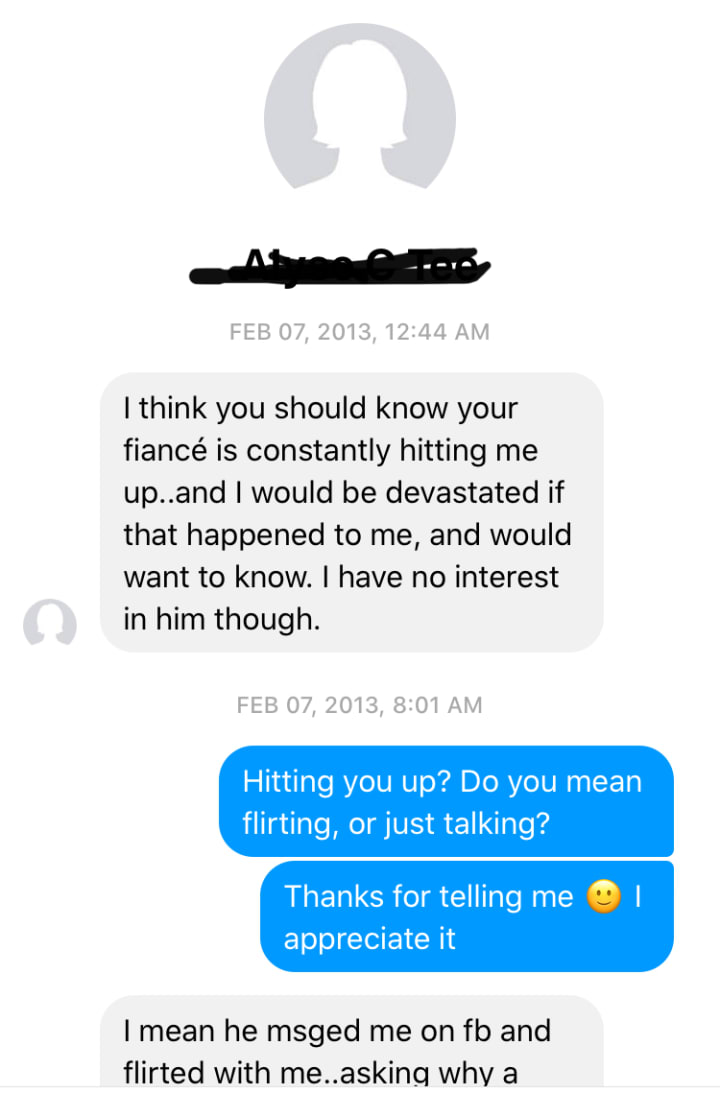 She was a pretty blonde, my canary in a coal mine. She opened my eyes, and showed me proof of my fiancées secret, dark side. I honestly stared at my screen, in the sunlight, blinking the tears away - dumbfounded that this was happening. My dreams crumbled and fell into oblivion and this was just the start of a very dark nightmare. At this point in time part of me didn’t want to believe, and just wanted to forget what I saw - but once trust is broken, it is very difficult - perhaps impossible to fix.