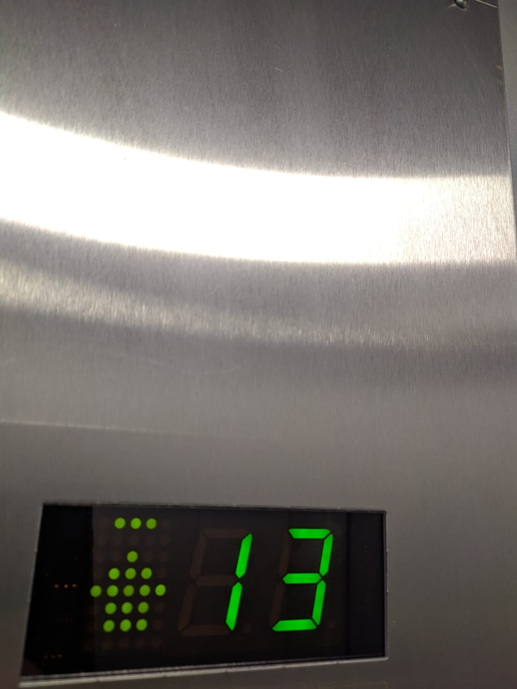 My floor was the highest number on the panel. Hoping his exit would be next, I held my breath. As each person exited one floor after another, my palms began to sweat. As discreetly as I could I glanced over to the right and up. The green light emanating off of the number 13 sent shivers through my entire body. He was getting off on the same floor.