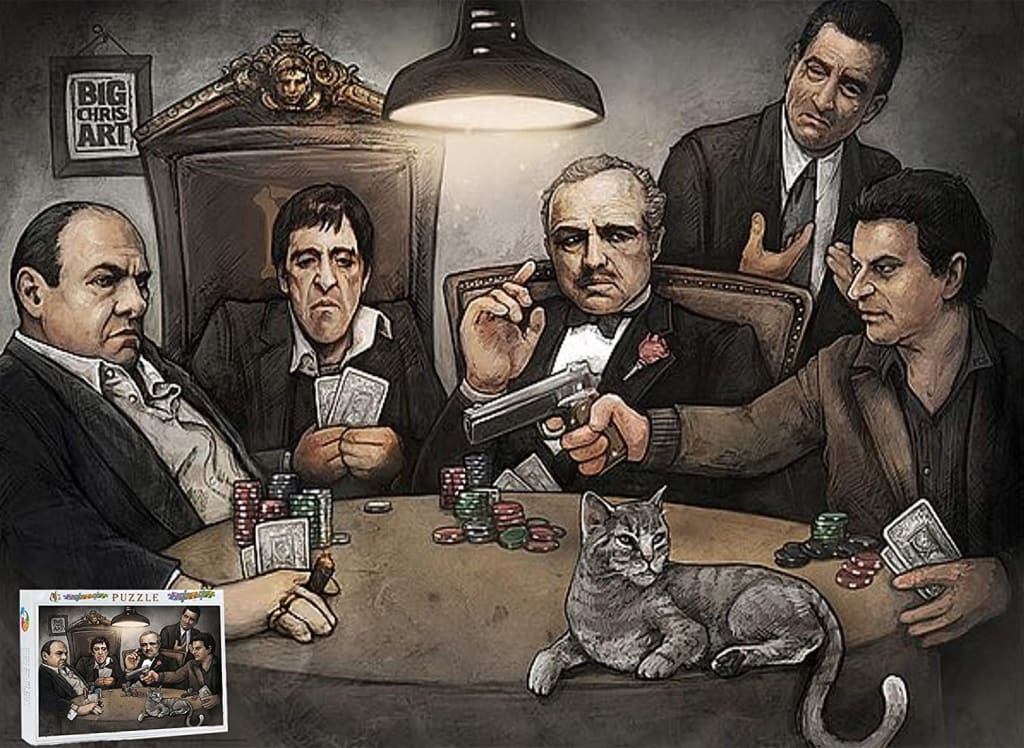 Patricia responded with a smile, “This is a puzzle of all the famous movie gangsters in the style of the Last Supper painting. Sweet Sarah found it online!” Nurse Justin stared blankly at the puzzle then to Sarah who was stifling a chuckle. “See, here in the middle is Scarface, next to him is Marlon Brando - he played the Godfather. And over here is James Gandolfini! The Sopranos is just wonderful.”