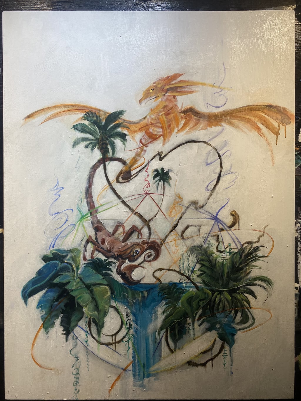 Several months went by before I attended another retreat, and I was inspired by a few friends tattoos. I began contemplating what I would want on my back. For several weeks I gave the idea some consideration. I chose the scorpion to reflect my zodiac sign of scorpio. The Chakruna leaf and Banisteriopsis caapi vine, (the two ingredients of Ayahuasca tea), saving the scorpion from the edge of the waterfall, a heart shaped with the tail of the scorpion and the vine under the rising phoenix with the transformational backdrop of the geometry of the Merkabah. It really tells the story of a miracle in my life. I had the idea for several months and figure I would find right artist at some point. I found him at a night club in Reno with some friends. He was doing live painting in the club and had a bunch of copies of his paintings. His work was amazing. Original and challenging with depth and meaning and soul. I spoke with him that night and I got his card. We talked a few times in the month that followed, but the timing wasn't right and a year passed before I saw him again. His art was catching on online. He had begun selling pieces for five thousand and more. We finally clicked with the idea and he got interested. We went to his studio and went over it a few different times, and he began working on it. Artists like Michael Heltebrake are a rare breed. He had a lot of projects and was getting very busy, and mine was one of two personal pieces he was willing to do, so it took him a year to do this piece. I may take it to him this spring in Colorado because he wants to work on it more. I am currently in the process of finding the right tattoo artist to translate this piece from canvas to skin. This represents my dark night of the soul and the gratitude I have for this miracle from the ancient world. I don't know where I would be had she not found me...