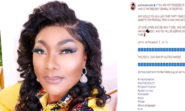 Nollywood actress and preacher Eucharia Anunobi is here with another marriage counsel and this time its specifically geared towards women over 30. In her writeup, Eucharia advised women against words they should run away from hearing from romantic partners; and explained also through social media what she believes marriage should be about. Here's what Eucharia Anunobi had to say.