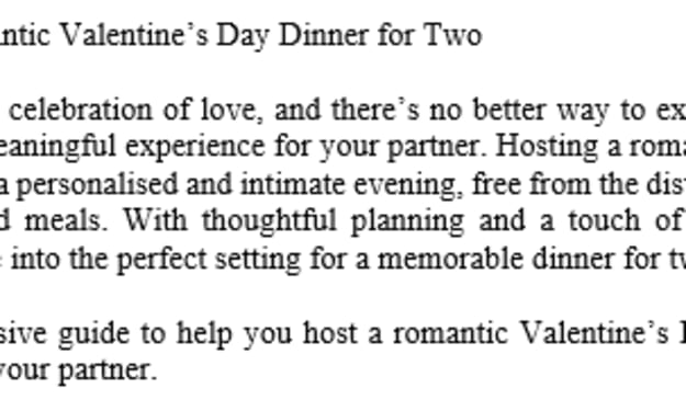 How to Host a Romantic Valentine’s Day Dinner for Two Valentine’s Day is a celebration of love, and there’s no better way to express your affection than by creating a meaningful experience for your partner. Hosting a romantic dinner at home allows you to curate a personalised and intimate evening, free from the distractions of crowded restaurants or rushed meals. With thoughtful planning and a touch of creativity, you can transform your home into the perfect setting for a memorable dinner for two.