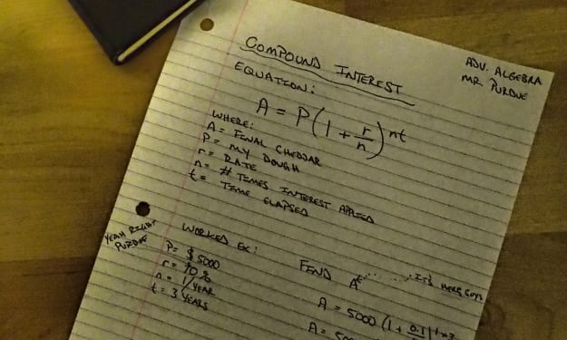 “The total amount, A, equals the principal, P, multiplied by the summation of one plus… where n is the number of times interest is compounded…” I feigned Herculean effort and grunted like I had just successfully squatted mom’s minivan. Mr. Purdue’s Advanced Algebra was my final labor. Pass the exam, and summer was mine.
