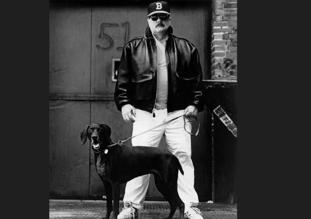 A big man, not so much fat as youthful muscle spreading out to middle-aged girth, jeans and sneakers, plain red t-shirt under a black leather jacket, inscrutable sunglasses and old-school mustache beneath the brim of a vintage Boston Braves cap. One of his thick hands hangs open at his side, ready for action, the other is fisted around the leash of the German short-haired pointer standing alert in front of him. They appear to be in some back alley in front of a rusty loading bay, the building’s brick wall and the edge of a quintessential city dumpster just visible to one side. This man could be an off-duty security guard or bouncer, a cop or a criminal, in general someone you wouldn’t fuck with. "Fuck" was a word I knew well then but had only whispered to myself or written on notebook pages I immediately threw out by that point, but it was definitely the right word for what you wouldn't want to do with this bruiser. He looked tough but, and here's another singularity within my experience up to then, not threatening. Don't mess with him and he won't mess with you. He gave the impression of strong silence, not a reluctance to speak but the security of not needing to unless, until, he has something worth saying.