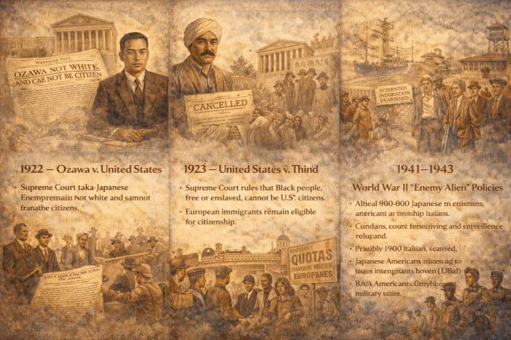 The Immigration Act of 1924 illustrates this difference clearly. The law imposed strict quotas that drastically reduced immigration from Southern and Eastern Europe, including Italy. Italian immigration dropped by nearly ninety percent. However, these immigrants were not completely banned. They were restricted, but still recognized as part of the broader white European population. In contrast, the same law effectively prohibited all immigration from Asia. Asian immigrants were not merely restricted; they were excluded entirely. They were also barred from naturalization through court rulings such as Ozawa v. United States (1922) and United States v. Thind (1923), which declared that Asians were not white and therefore ineligible for citizenship.