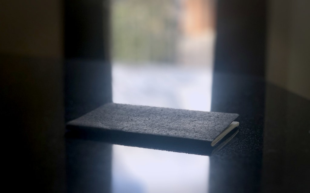 But then, while holding the metal shell, she realized there was still a package wedged within. Setting the mailbox down, Gabriela pulled out a thin-cardboard envelope, folded-over once to fit. It was addressed to her — Professor Nuñez — but had no return address. Curious as to what it was, she immediately tore the perforated seal and emptied its contents into her hand: a single, plain black notebook.